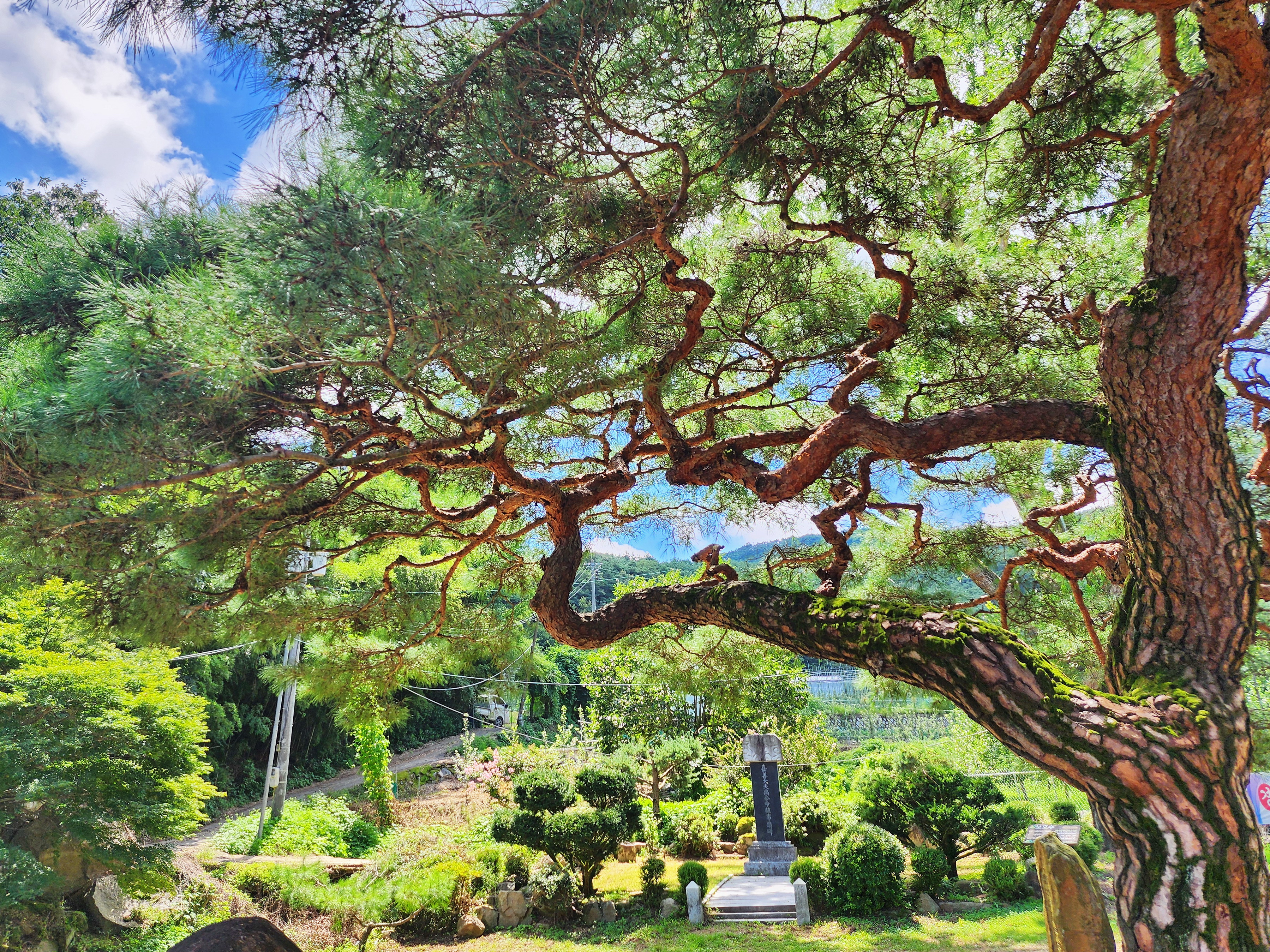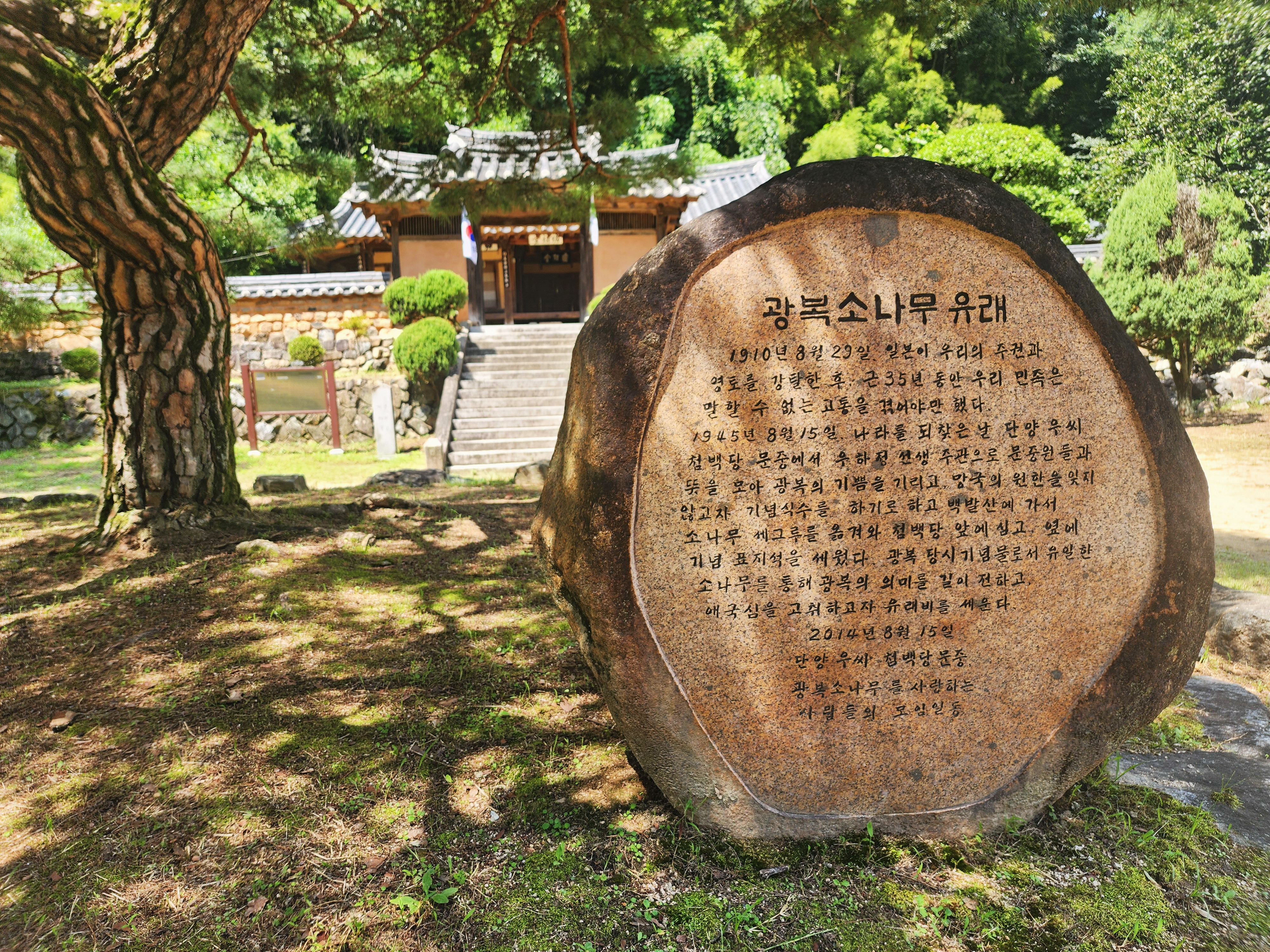 제80주년 광복절을 맞이하여 대경디카시협회 회원들과 망우당공원 내 항일독립기념탑에 참배를 하고 평광동의 광복소나무가 있는 첨백당에 들렸다. 첨백당 입구에는 소나무 한 그루와 은행나무 두 그루의 보호수가 있다. 은행나무는 수령 300년, 소나무는 100년으로 2,000년도 기준으로 추정한 고목들이다. 특히 소나무는 광복을 기념하여 그해 8월 15일에 심었다 하여 광복소나무라 한다. 가지의 뻗어 남이 조선인의 기개를 닮았음인지 범상치 않았다. 돌아오는 길에는 효자 강순항나무도 보았다.