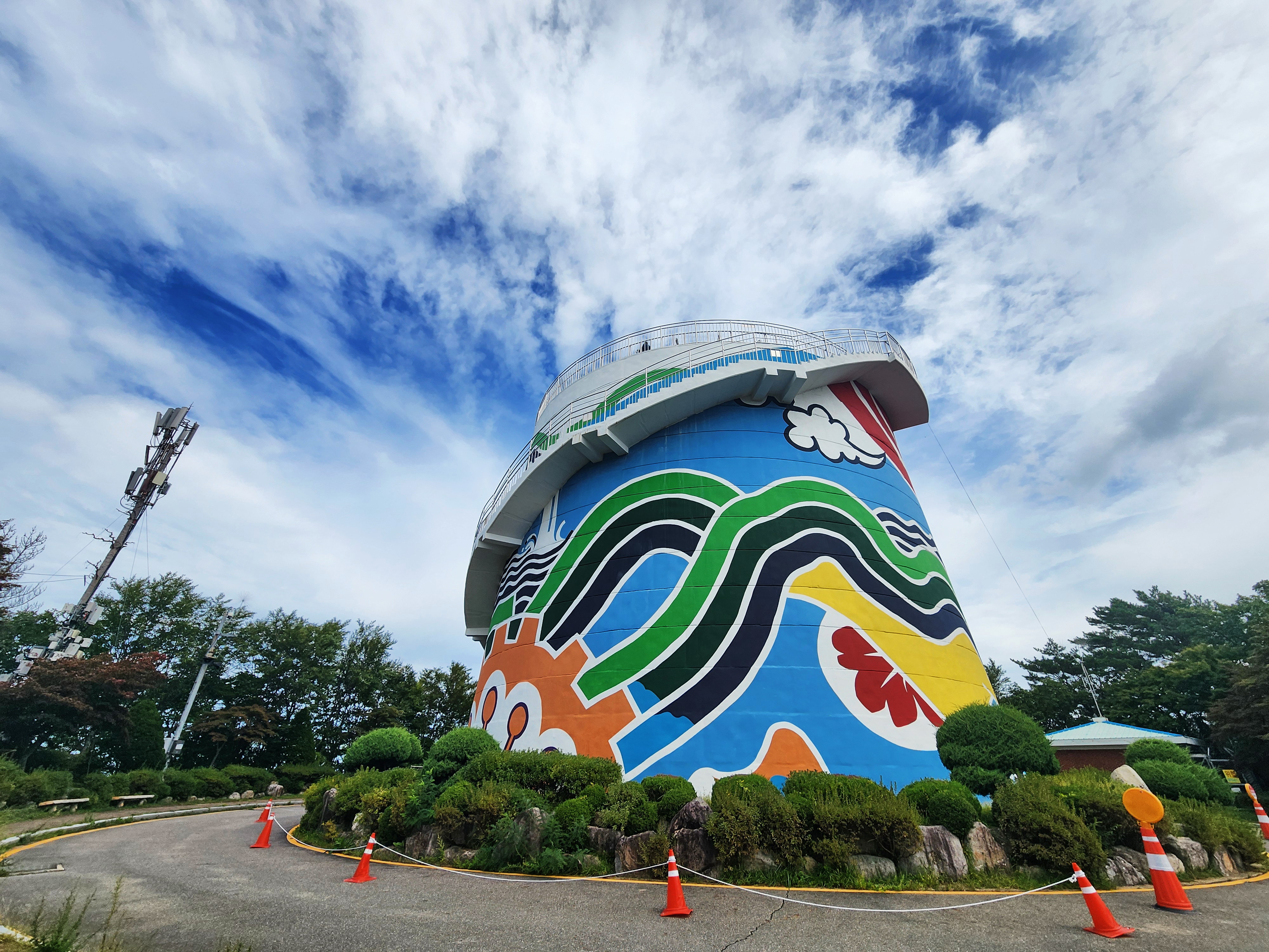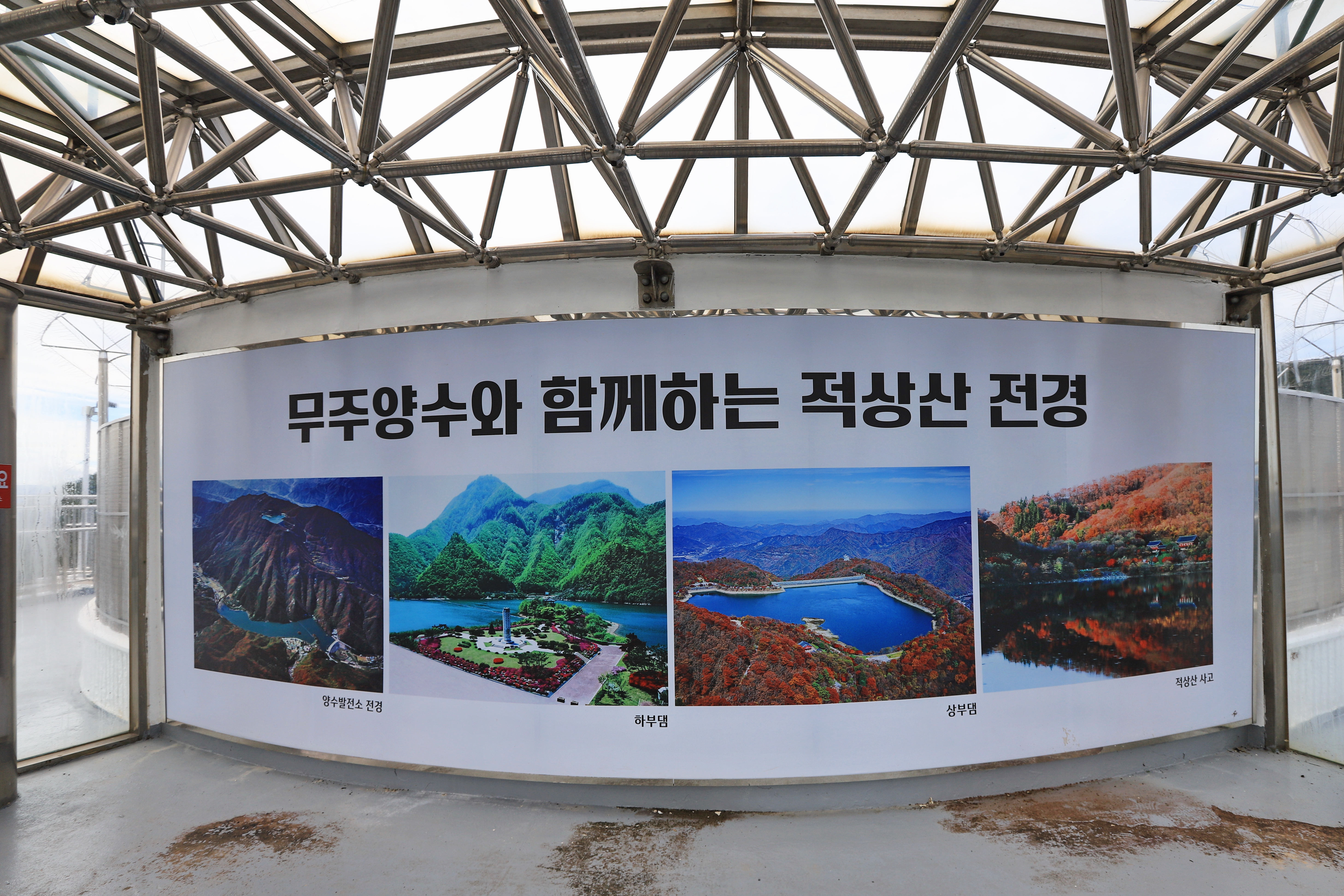 적상산 전망대는 무주 양수발전소의 상부 저수지인 적상호의 북쪽 끝자락에 자리하고 있다. 거대한 굴뚝처럼 생긴 전망대는 무주 양수발전소의 발전설비인 조압수조다. 발전기가 갑자기 멈췄을 때 수로 압력이 급상승하는 걸 완화해 주는 설비인데 건물 3~4층 높이 전망대 꼭대기에 오르면 소백산맥과 덕유산 전경이 파노라마처럼 펼쳐진다. 전망대를 한 바퀴 돌면서 무주의 아름다운 산하를 감상할 수 있다. 특히 늦가을에 찾으면 적상산의 붉은 단풍과 어우러진 풍경을 감상할 수 있다.