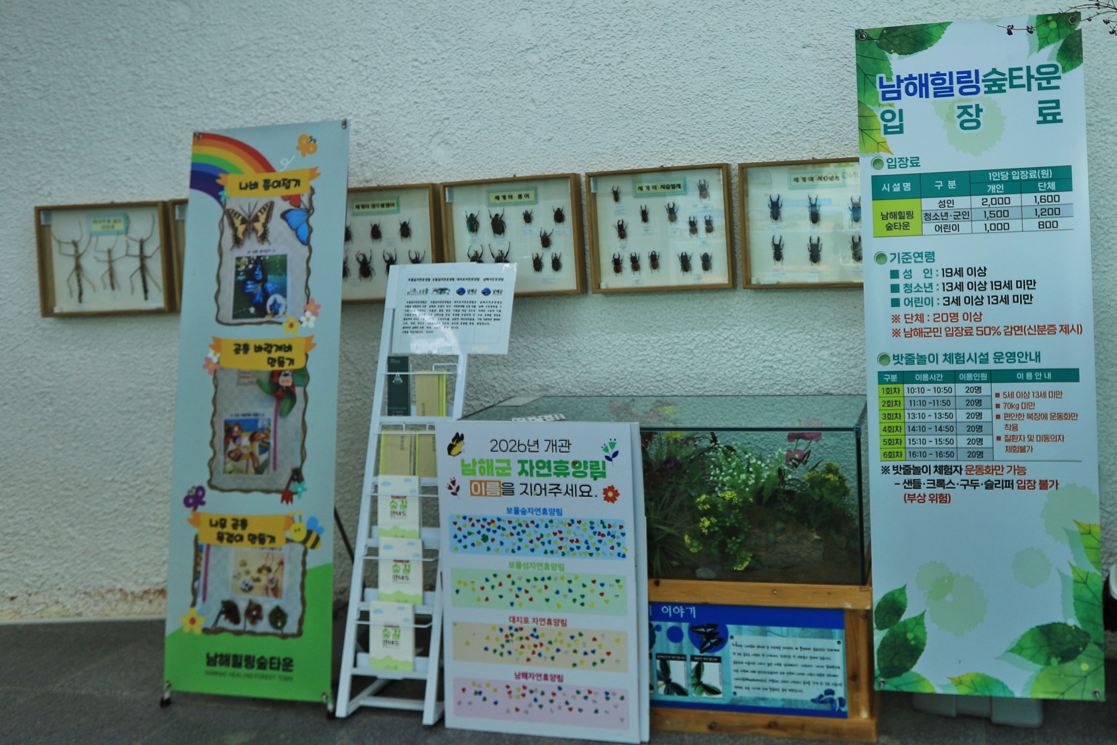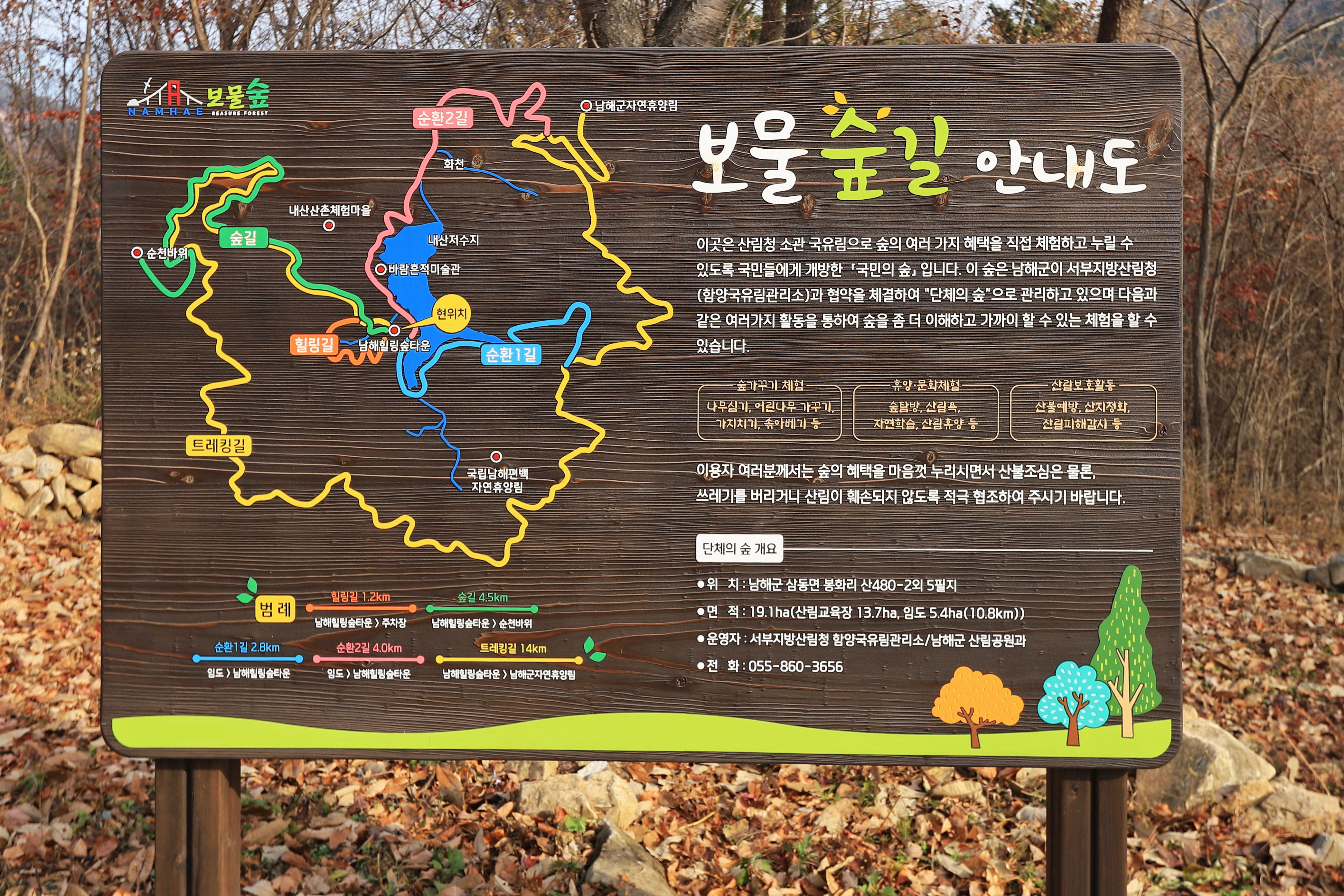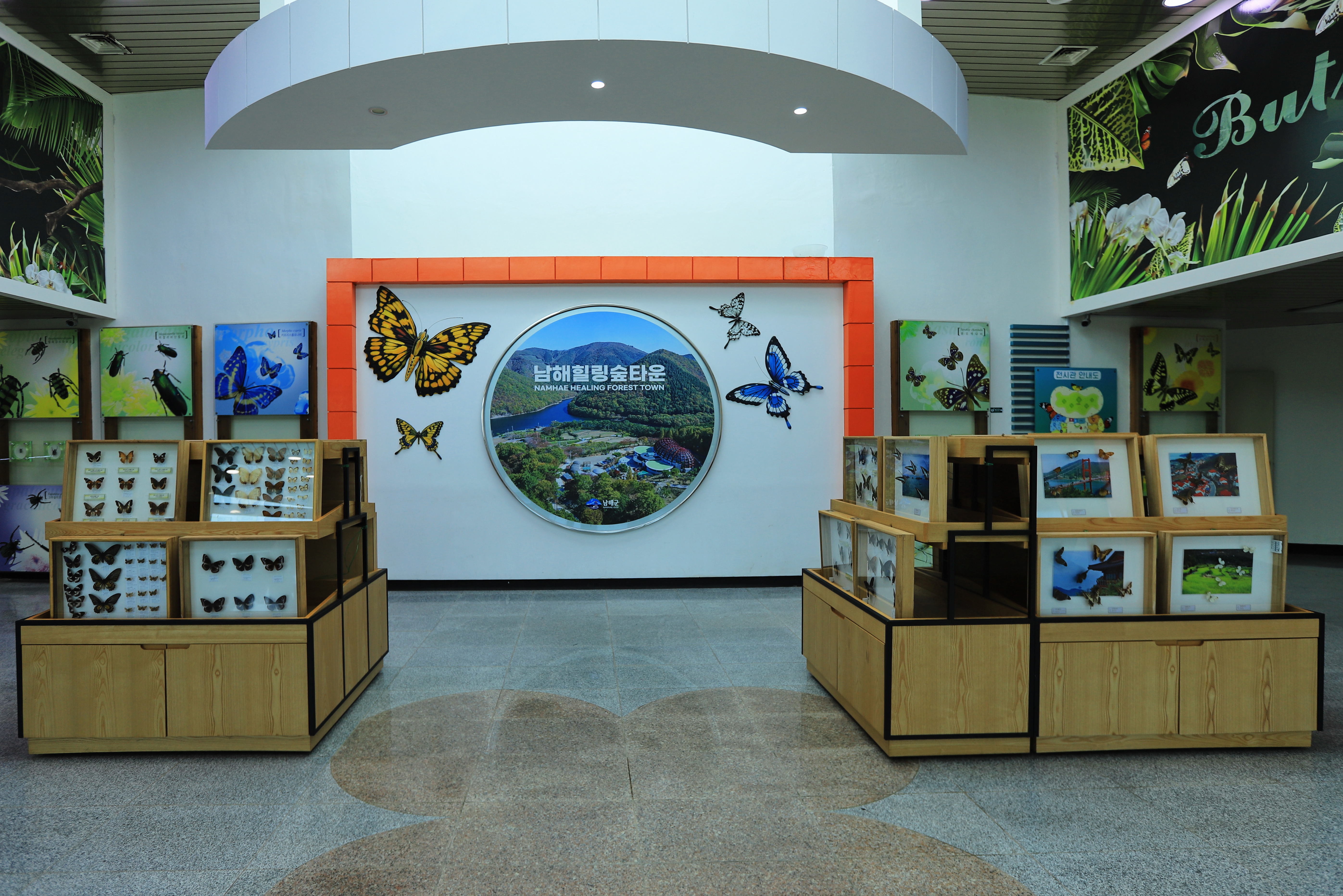 남해편백자연휴양림에 머물면서 인근의 남해힐링숲타운에 가 보았다. 옛날 나비생태공원이었단다. 오전 3회 운행한다는 전기관람차를 타고 보물숲길을 따라 순천바위 전망대로 먼저 갔다. 숲길은 대체로 완만하면서도 굽이굽이 돌아가는 좁은 길로 스릴감마저 있었다. 순천바위 전망대에서 약 5분간의 시간 여유를 주어 사진을 찍고 다시 내려오는 길의 포토존에서 눈 아래 정경을 볼 수 있는 기회를 가졌다. 산 정상부에 아름답게 솟아있는 순천바위에 관한 이야기는 날씨가 좋은 날 순천만이 보인다고 붙인 이름이란 것과 고기 잡으러 바다로 나간 남편을 기다리던 아내의 실화가 담겨 있다는 이야기로 두 가지 설이 있다고 한다. 단풍으로 유명한 이곳에 단풍철이 지난 탓인지 우리 부부만 태운 전기관람차로 숲타운에 내려와서 곧장 나비생태관을 관람하였다. 나비이야기로 구성된 제1전시관과 곤충이야기로 꾸며진 제2전시관을 둘러본 후 체험관은 들리지 않고 숲타운의 잘 꾸며진 정원을 산책하다 돌아왔다. 남해힐링숲타운에 가면 전기관람차로 순천바위 전망대로 가는 코스는 꼭 이용해 볼 것을 권하고 싶다.