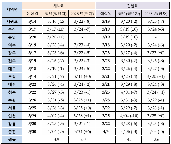 □ 주요도시 봄꽃 개화예상시기 (개나리, 진달래)