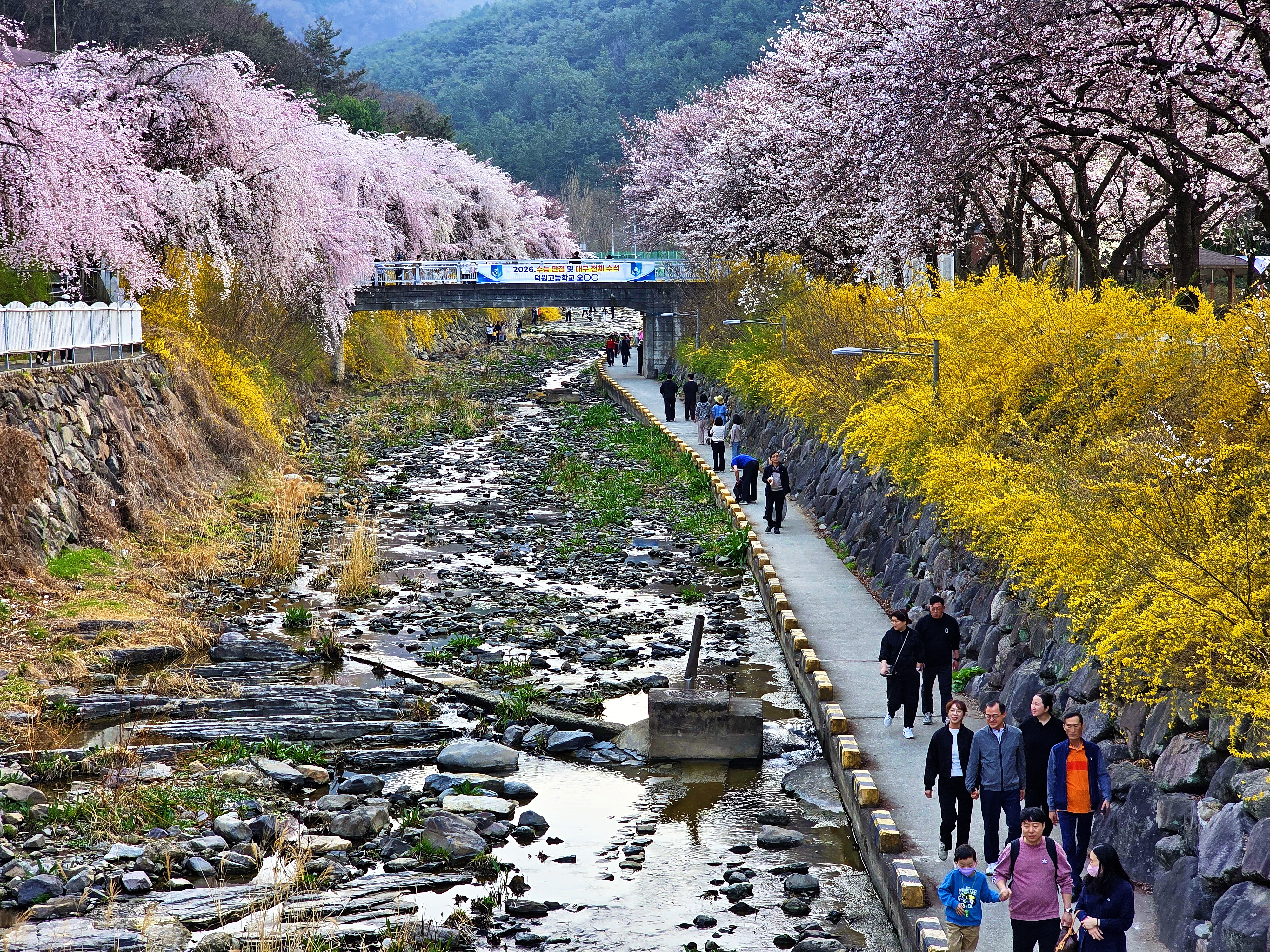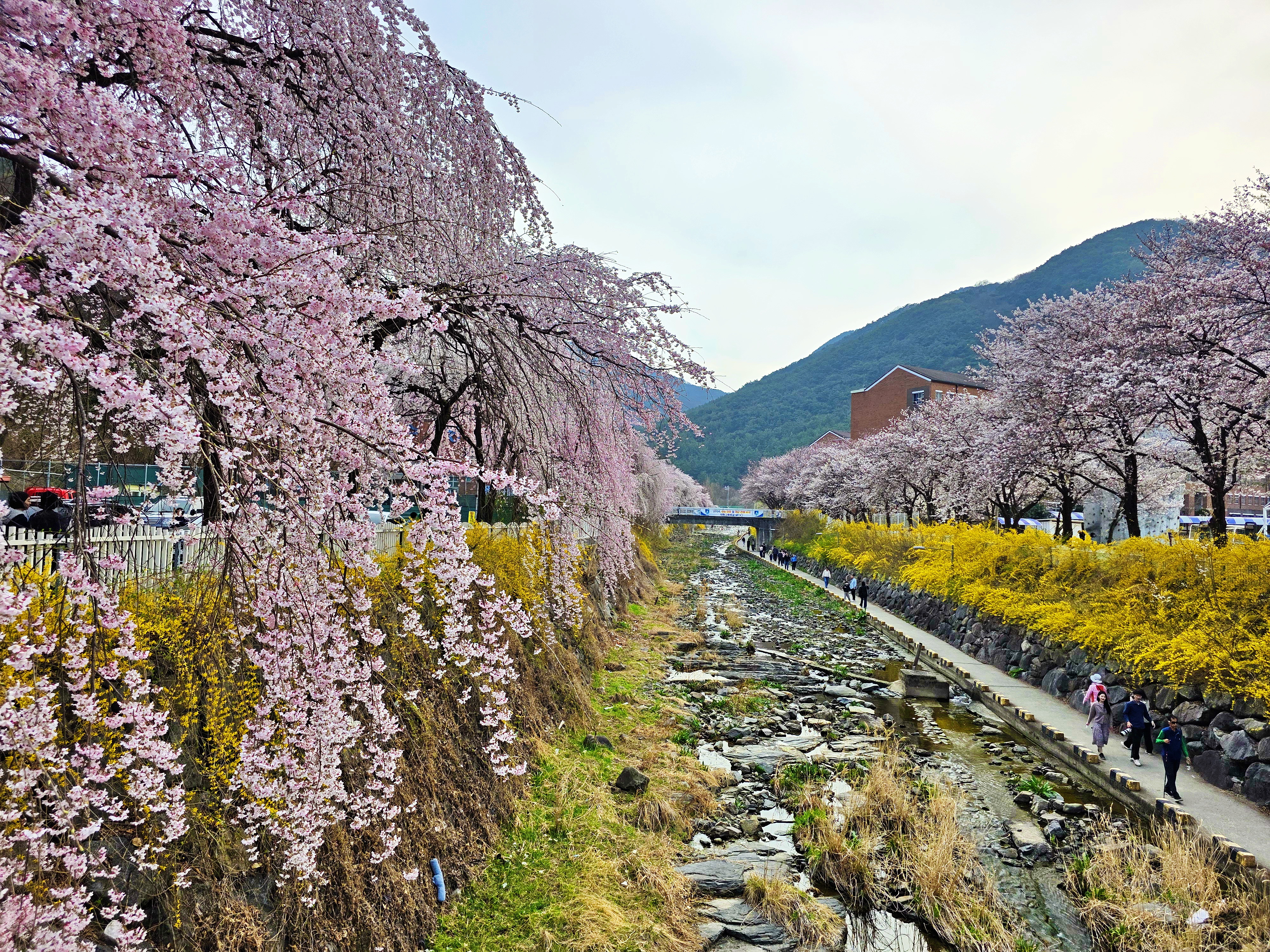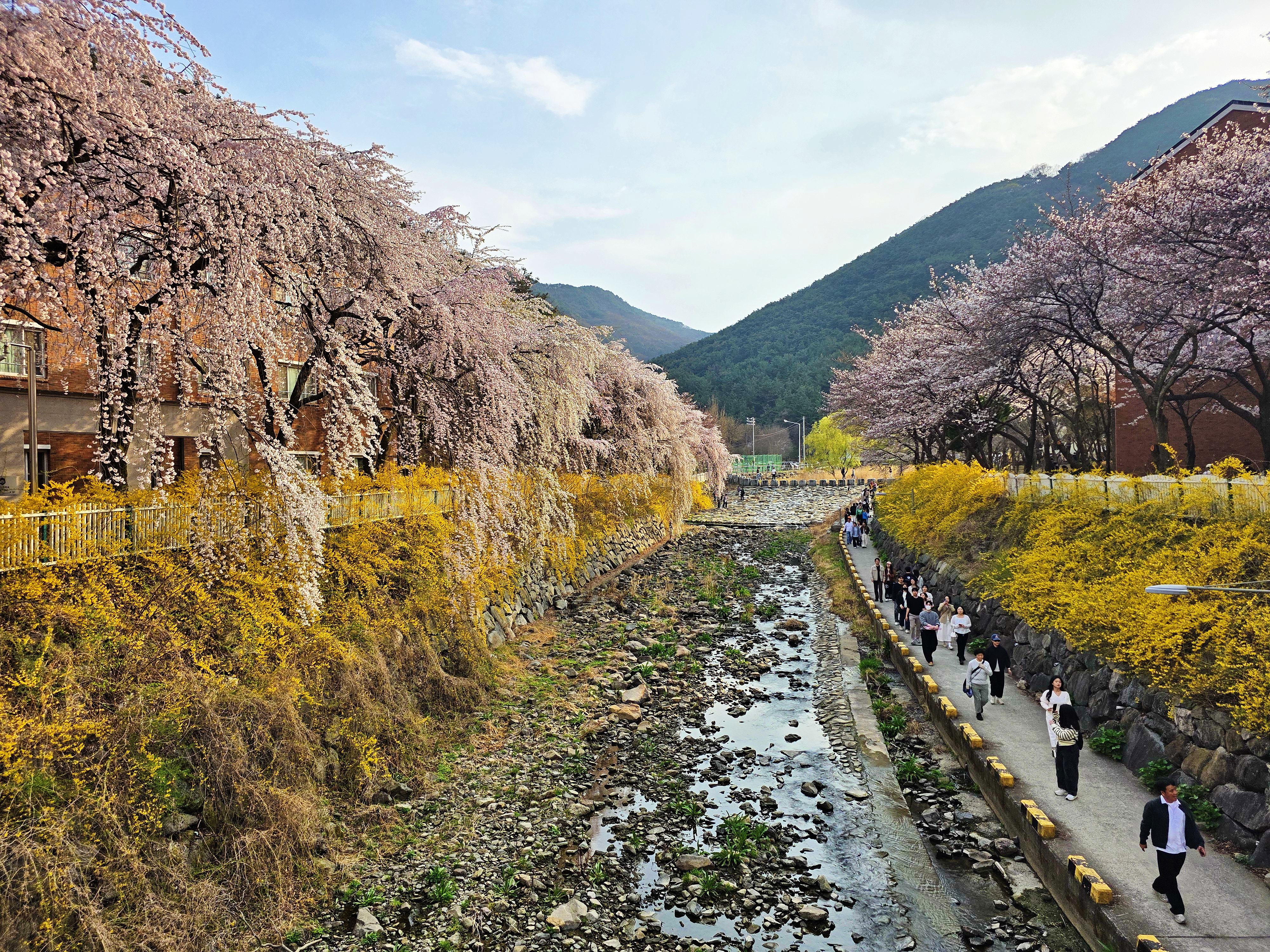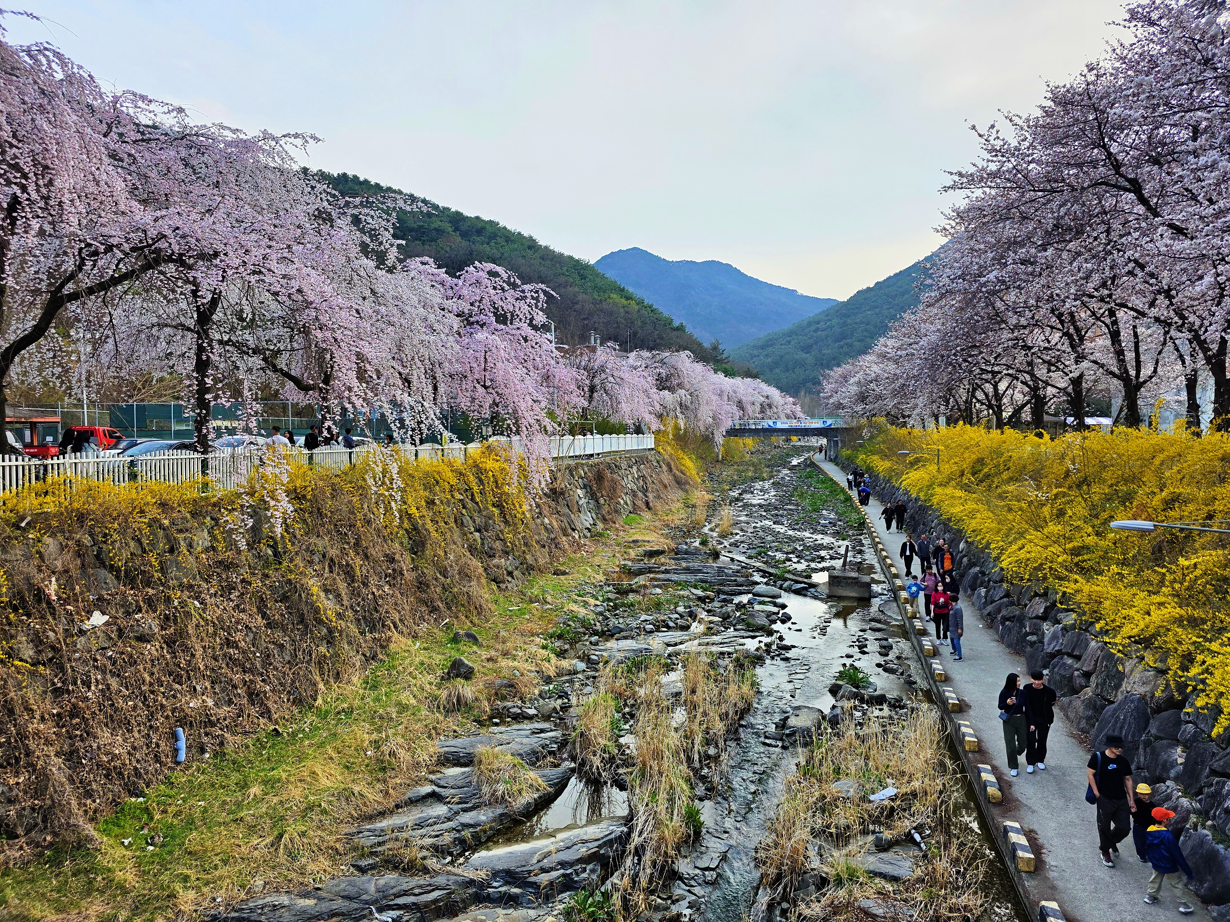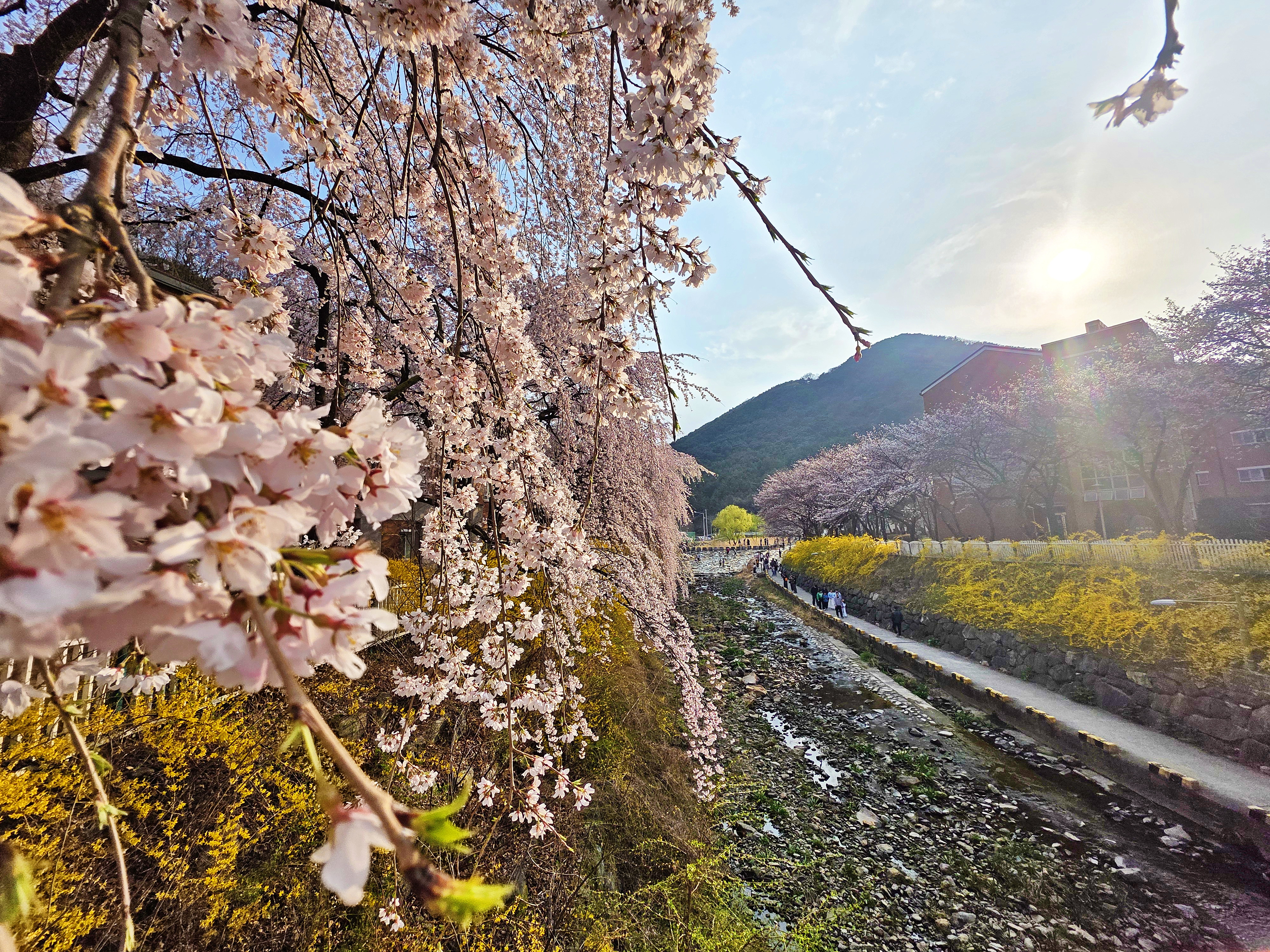 수양벚꽃이 수줍게 고개를 숙인 욱수천에는 청춘남녀들의 웃음소리가 바람을 타고 꽃잎처럼 흩날린다. 수줍은 고백처럼 피어난 개나리와 폭포수처럼 쏟아지는 벚꽃길을 걷다 보면 마음속엔 어느새 잊고 지내던 설렘이 뭉글뭉글 피어오른다. 늘어진 가지 사이론 아이들의 천진난만한 웃음이 걸리고 부모님의 뒷모습 위로는 따스한 봄볕이 내려앉는다. 노란 개나리 물결과 우아한 수양벚꽃이 어우러진 이곳, 욱수천은 이제 가족 모두에게 잊지 못할 봄의 기억을 선물하는 소중한 명소가 되었다.